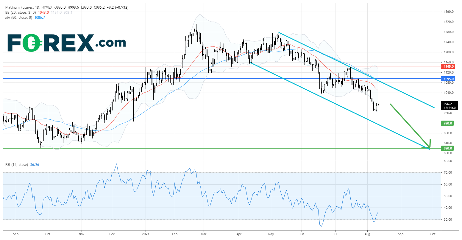 在日线图上,白金期货目前仍在下降通道内操作。下降的20日和50日均线都表示技术走势看淡。相对强弱指数亦处于超卖水平,指出下行动能强劲。