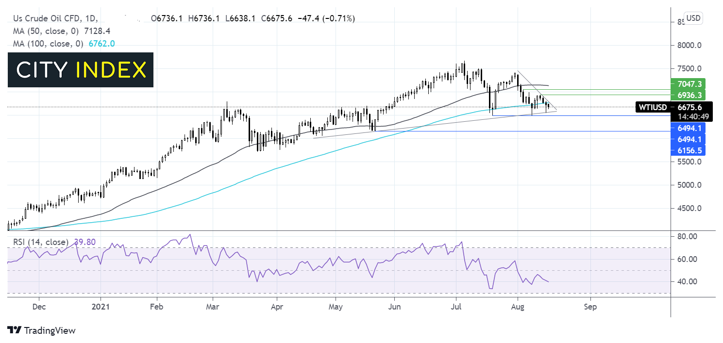 卖盘需看到油价下破上升趋势线支撑位65.70,以测试7月低点65.00支撑位。5月的61.50也可能提供支撑。