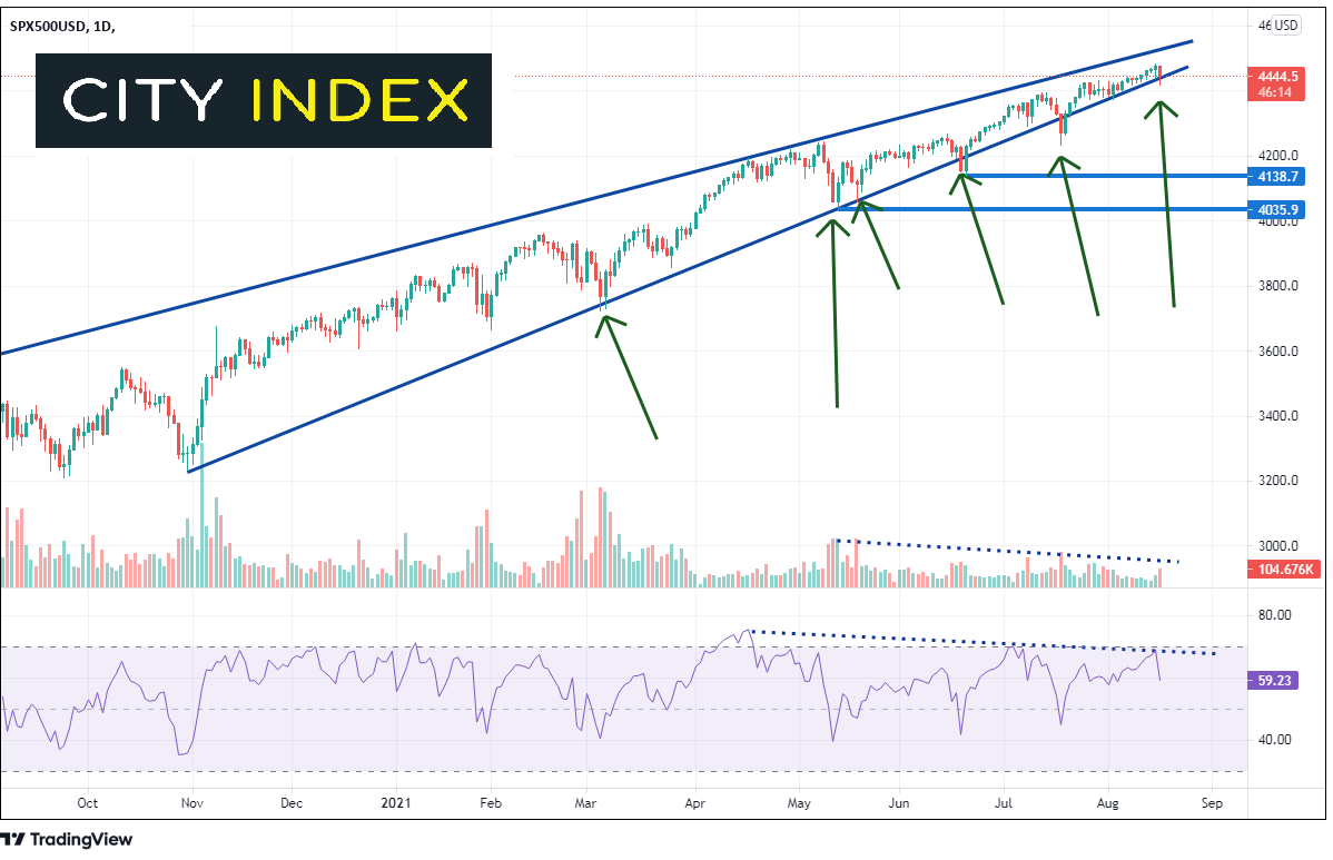 我们以前也看到过这样在诸多负面消息中先跌再折返的走势。标普500指数自从创下2020年3月疫情低点以来一直处于长期上涨趋势中。2020年9月和10月,价格开始构筑上升楔形。但每次楔形下轨趋势线被考验都是股指被买入时,股指随后回到楔形内部。周二也是如此。价格下破下轨趋势线4440附近并收在该位上方不远处。请注意,在5月以来价格上涨的同时成交量不断萎缩,RSI也在向下。