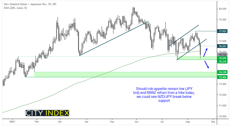 上述背景使得纽元/日元成为今天的关注重点。该交叉盘日图加速下跌摆脱修正通道,堪堪止步于7月低点。价格已反弹至略高于75.27 – 75.58支撑区域的水平,如果新西兰联储一如市场最开始的预期那样加息,该区域可能吸引胆大的多头介入。但若在新西兰联储今天没有加息(也没有暗示很快加息)的同时日元继续受多头青睐,那么纽元/日元可能下破75.27。
