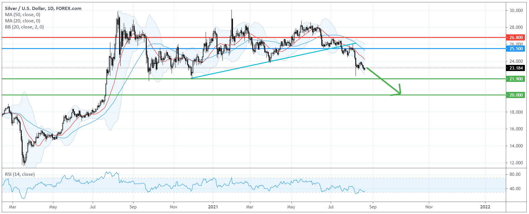 现货白银 (XAG/USD):走势乏力,下看20美元