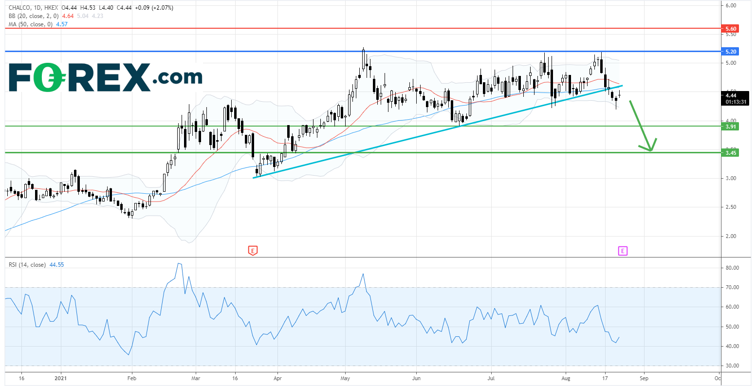从技术层面看,中国铝业的日线图走势已转淡,因股价已经下破由今年3月拉出的上升趋势线。而20日均线亦开始掉头向下,相对强弱指数的走势亦转为看跌。