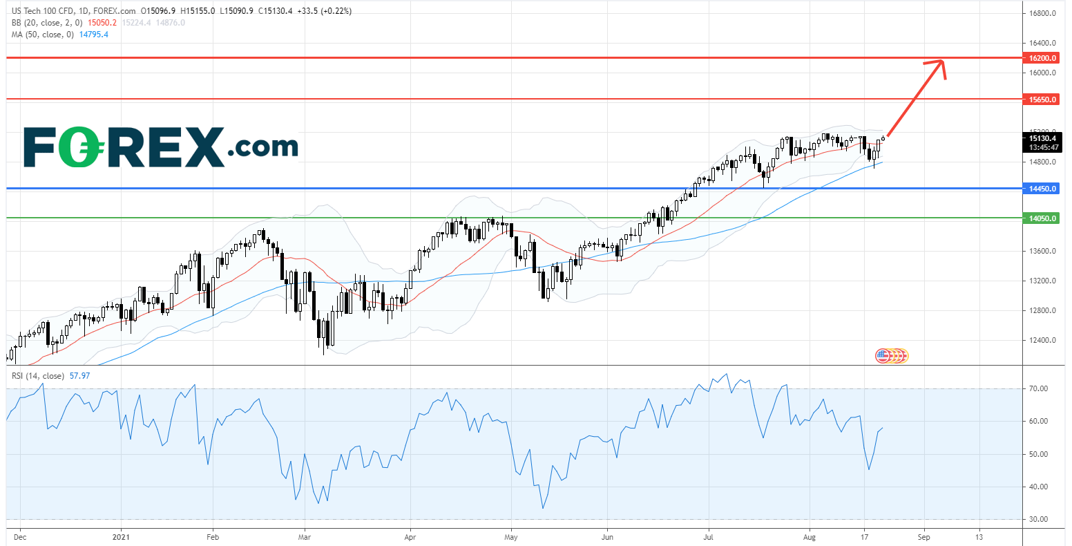 主要支持 (止损) 位已经上调至7月低位14,450点,上行目标则維持在15,650点和16,200点。