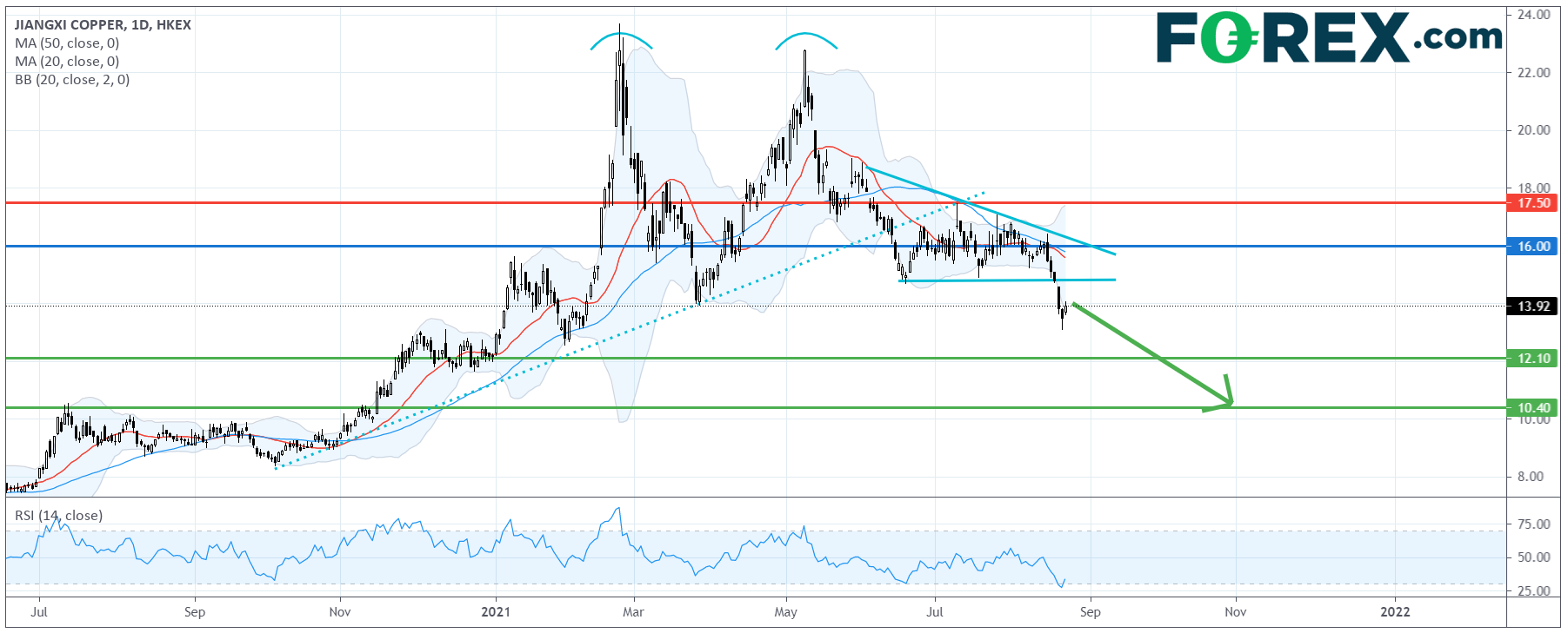 在日线图上,江西铜业股价已接近到达我们8月初时定的目标,但股价技术走势仍然疲弱。目前,它跌破了一个下跌三角形,并进一步远离20日及50日移动均线。