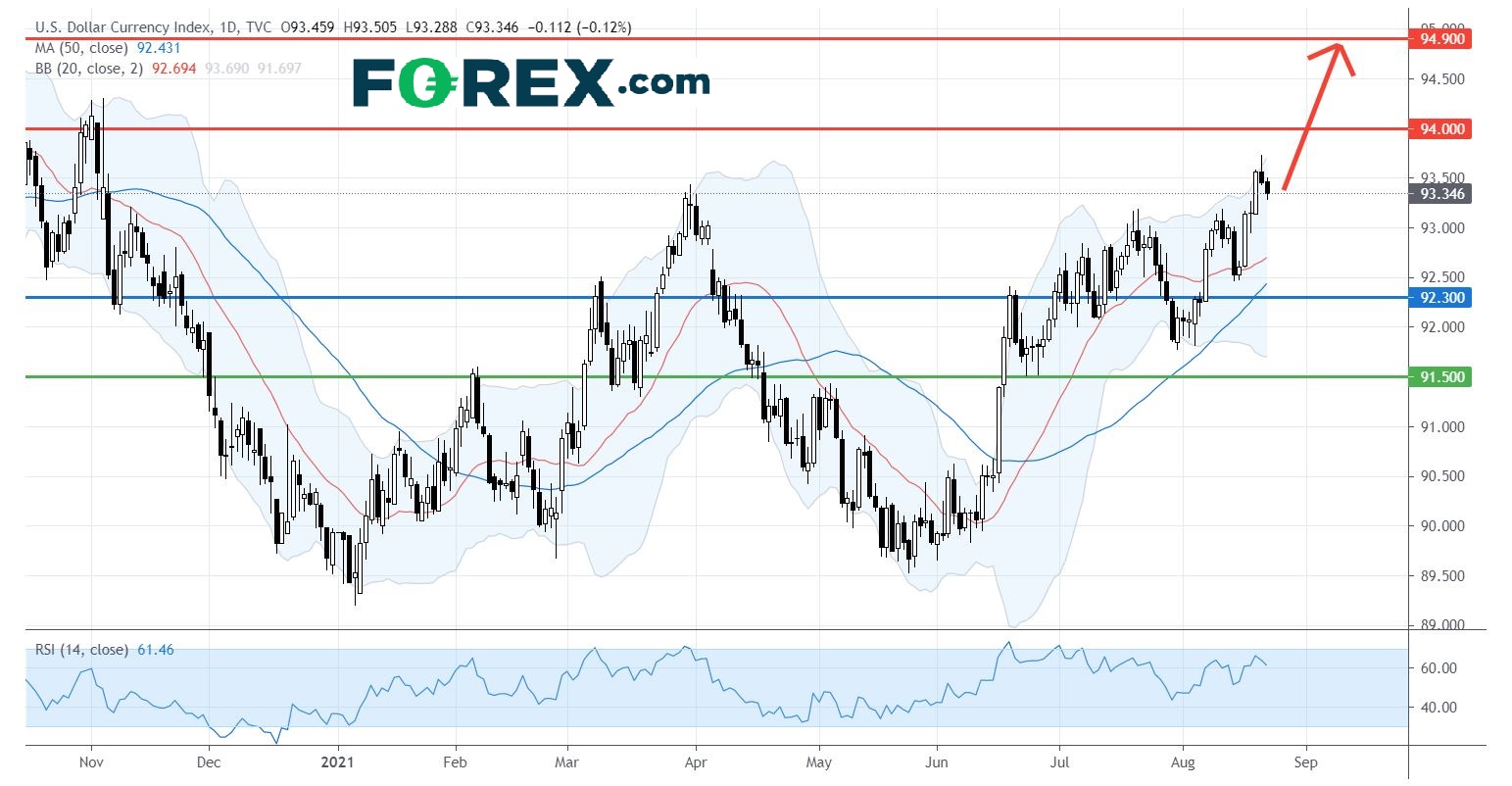 在日线图上,美元指数最終走出整固阶段,超越我們之前所定的上行目標93.20點。
