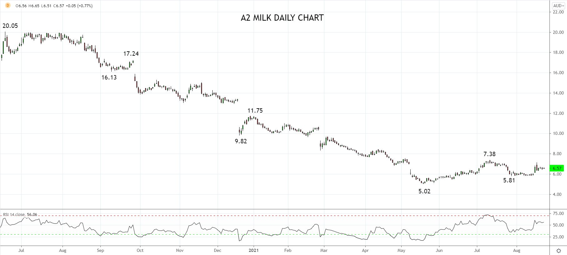 在短短12个月的时间里,A2牛奶股价自20.05澳元跌至5.02澳元低点,该股近期有所企稳。尽管如此,除了急剧抛售之后可能出现修正反弹外,并无任何明显的技术面或基本面理由支持买入A2牛奶股票。如果对上周的收购传闻终将落实持有预期,那么可以考虑在6.57澳元价位买入该股,止损点设在5.75澳元下方。