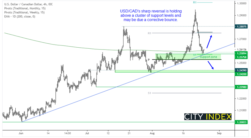 鉴于美元/加元就四小时图看涨趋势相对深度回调后,现于附近存在多个支撑,货币对可能迎来回弹。价格正守在趋势支撑上方并徘徊于200天EMA均线以及周线图一号支撑枢纽附近,略下方为月线图支点。我们希望看到汇价下破月线图支点后再考虑看空。在此之前,我们预计汇价将自支撑区/趋势线反弹并攻向1.2700 (月线图1号阻力和周线图支点1.7250也将成为合理目标)。