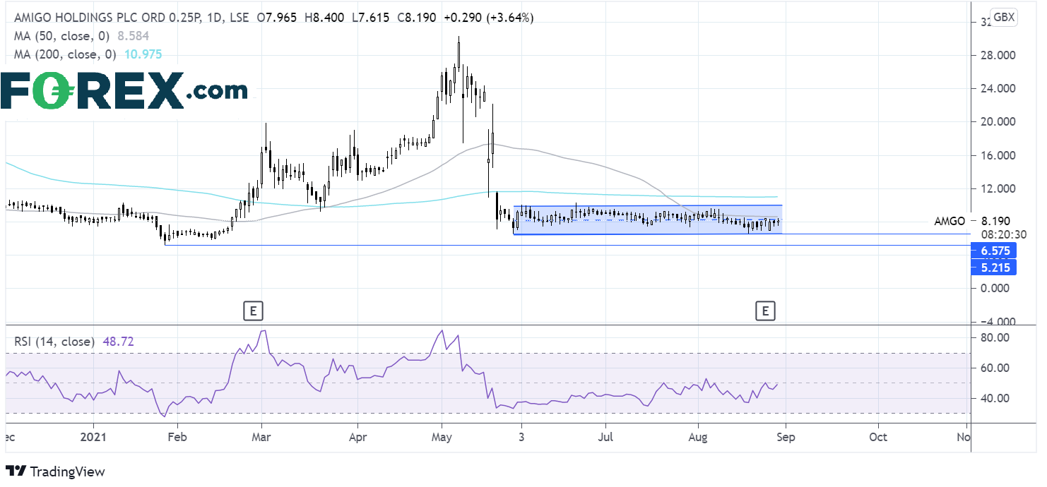 Amigo股价在5月达到30.30便士年度高点后急剧转跌,市值蒸发了三分之二。股价此后一直处于一条保持通道内部,上档封顶于10便士,下档受限于6.6便士。