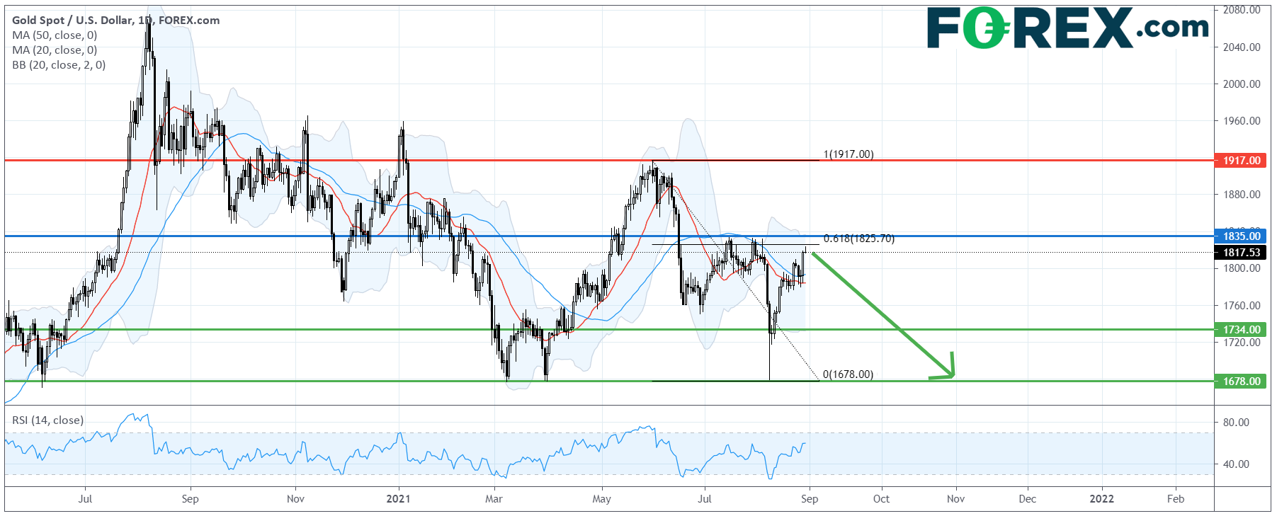 在日线图上,现货黄金技术走势迫近关键阻力。目前它仍未越过8月份高点,并受制于始于6月的跌势的61.8%费波纳奇回档位。