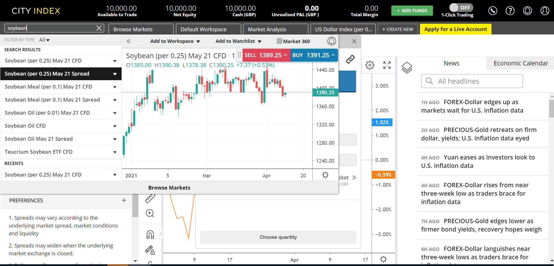 制定好计划、筹划机会后,开仓和平仓就容易了。只需在WebTrader搜索栏搜索“大豆”(请看下图),就可以选择通过现货价格,或者期货价格,以点差押注或差价合约的方式进行交易。