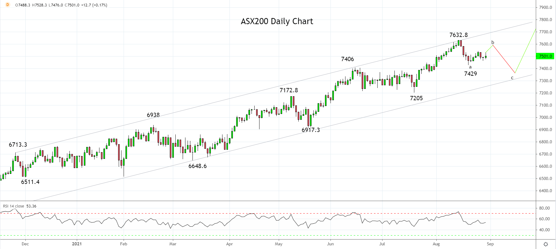图表来看,在自8月中旬7632.8高点回落后,股指自7429低点的反弹被视为三浪调整中不完成的第二浪(浪b)。若跌破7429低点,则表明正在展开第三浪推低(浪c),探向7320/00附近趋势通道支撑,该水平仍是我们首选买入水平。