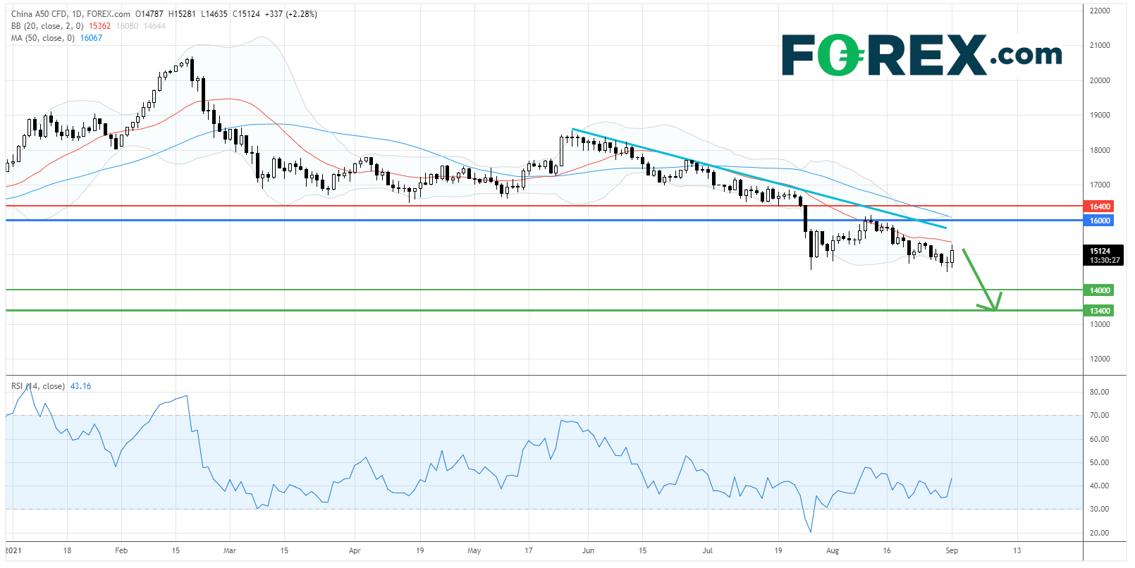 中国A50指数CFD : 跌势难除,或下试14,000点