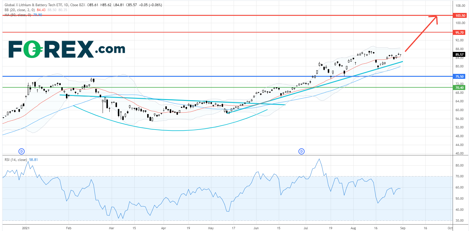 Global X锂、电池ETF(LIT.US): 上行走势持续,首目标95.70美元