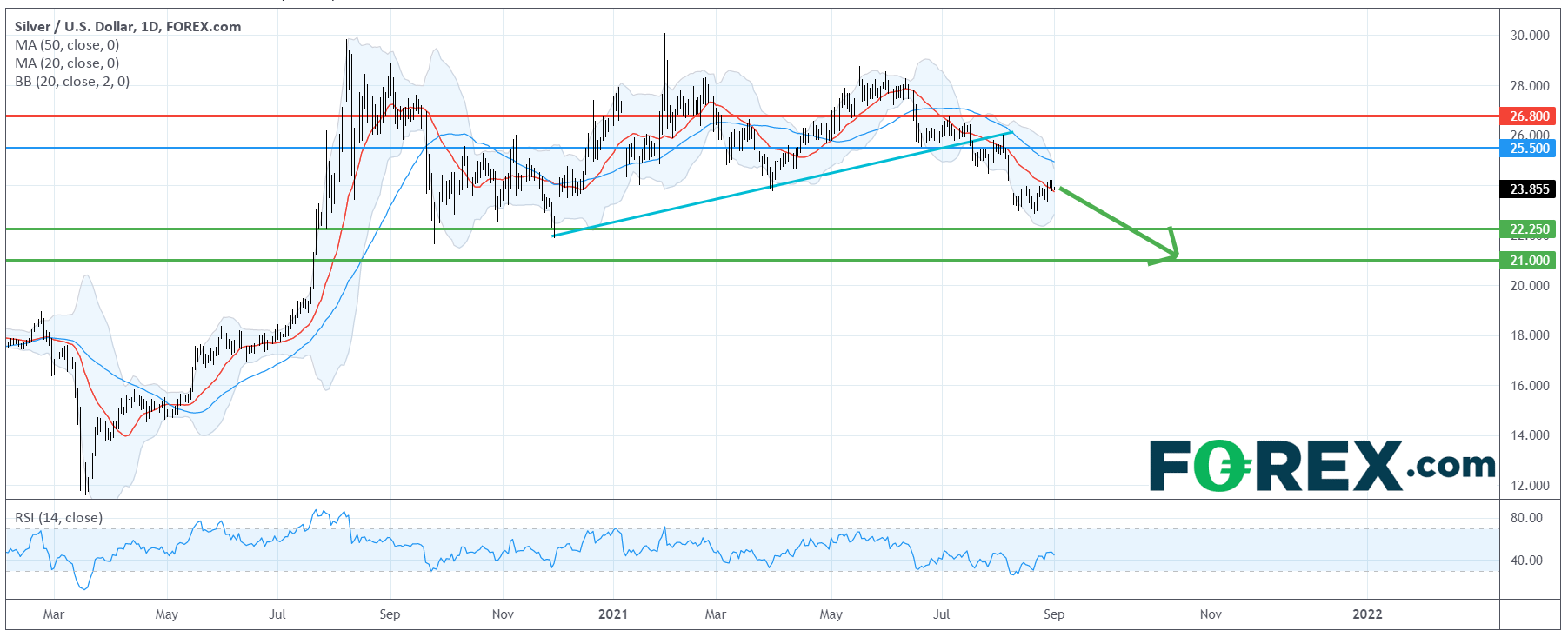 只要主要阻力 (止损) 位25.50美元不破,银价料将下探下行目标22.25美元及21.00美元。