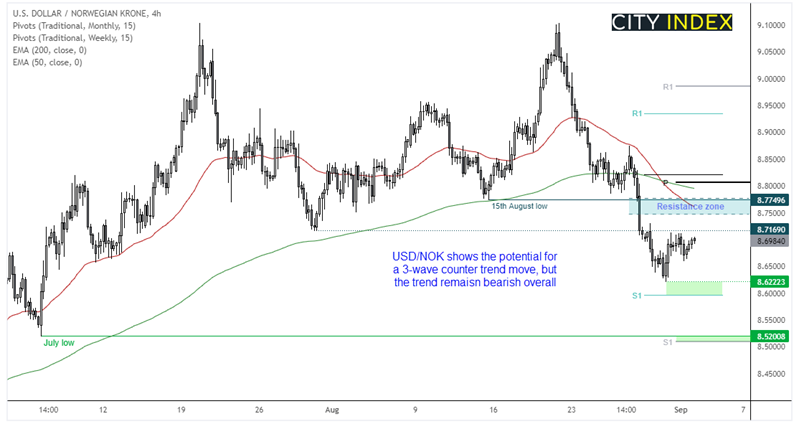 自8月20日形成双顶以来,美元/挪威克朗已下跌超过5%。货币对尝试在200天均线附近见底,因此,汇价有可能自当前水平展开小幅反弹,但当前动量仍整体支持探入新低。