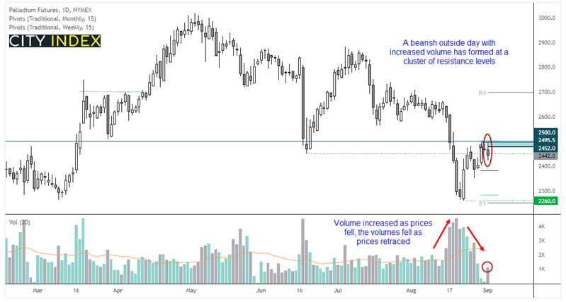 钯金隔夜或已在阻力密集区域下方构筑波段高点。空头大量涌现导致钯金价格自2600以来的跌势伴随着成交量的放大, 而2260以来的反弹则因空头了结出场而伴随着成交量的减少。正如昨天视频中所讨论的,我们等待成交量放大的同时在阻力位出现反转K线,而昨天在阻力位出现的看跌外包K线满足了我们的期待。