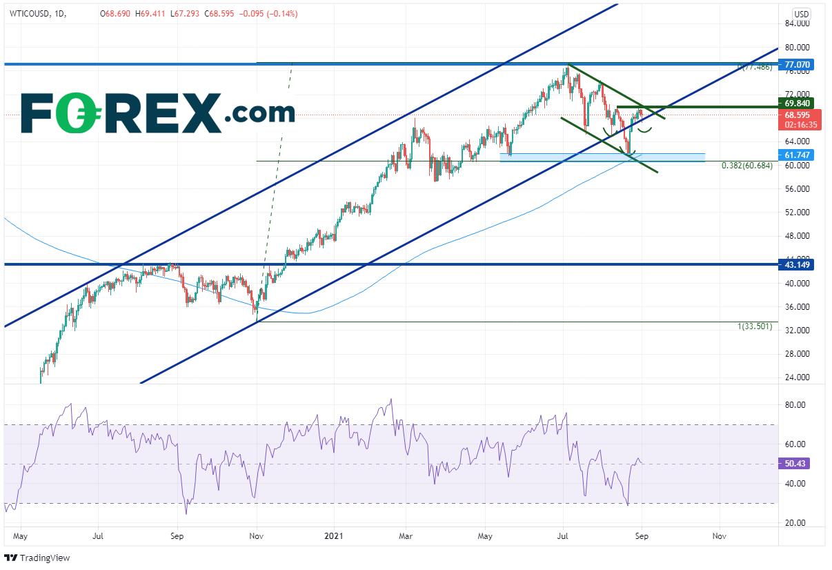 自从在2020年4月形成低点,西得州原油一直处于一个上升通道内,但在探入2018年高点,即略高于77的水平后回撤,形成一个看起来是修正的通道(请看下图绿色部分),并且守在支撑汇聚区域,其包含修正通道的下轨趋势线、200天均线和2020年4月低点到7月6日高点行情的38.2%回档位。