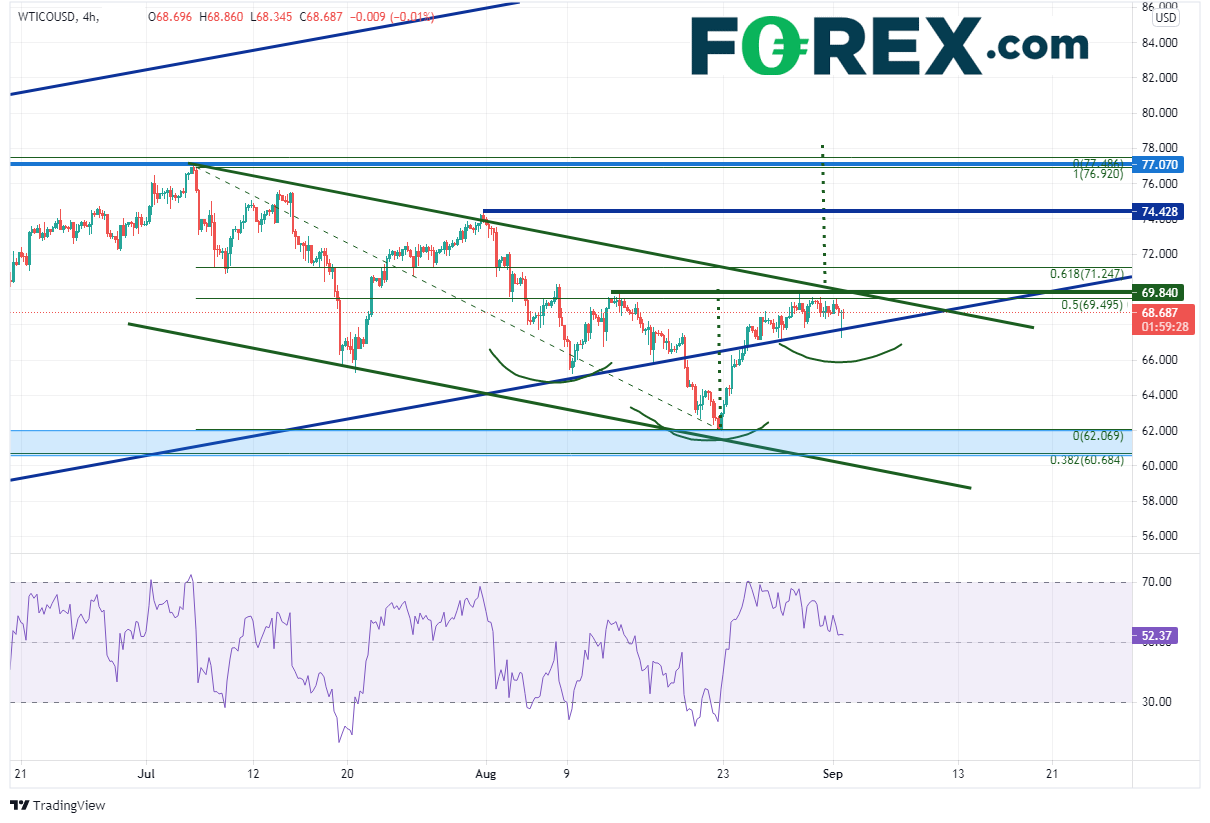 价格从近期低点反弹的行情或正在形成头肩底形态,最高到达69.80附近,那是水平阻力位、通道上轨趋势线和7月6日高点到8月20日低点的50%回档相汇处。其上为72.43的水平阻力位,目标为头肩底形态的测量目标,即7月6日高点。今天守住长期上升通道的下轨趋势线,即67.29附近,如果失守,价格可能一路下行至63.87附近的水平支撑位,然后是8月20日低点62.43附近。