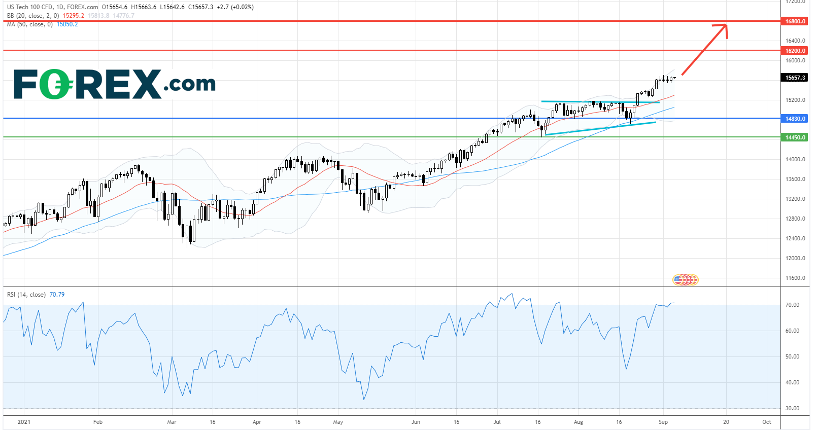 在日线图上,美国科技股100指数CFD上破7至8月之间的整固区间后持续上升,并在历史新高附近交投。目前,指数价格亦在上行的20日和50均线之上操作,相对强弱指数显示出强劲上行动力。