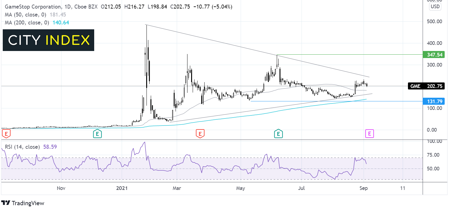 GameStop股价近期自8月下旬的150低点反弹,并交投于一个三角旗形内部,或表明随着价格逼近形态终点,突破即将到来。