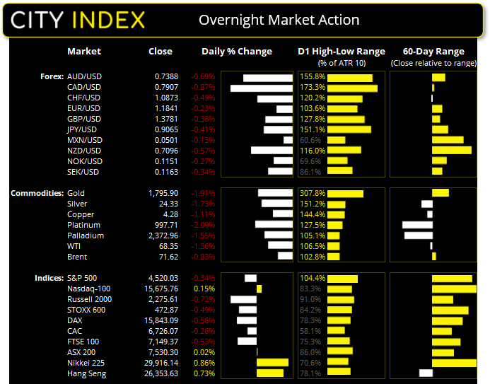 在长周末后的第一个交易日,科技股小幅上涨。纳斯达克100指数上涨0.15%,但收盘还是在历史新高处形成小小的十字星。苹果和奈飞股价同样升至历史高点,原因是市场认为,在美联储立场温和的环境中,对新冠病例数增加的任何担心情绪,对这类公司的影响较小。但股市整体收低,标普500指数下跌0.34%,一度触及5天低点,领跌的是公用事业股与必需消费品板块。道指下跌0.71%,至2周低点。