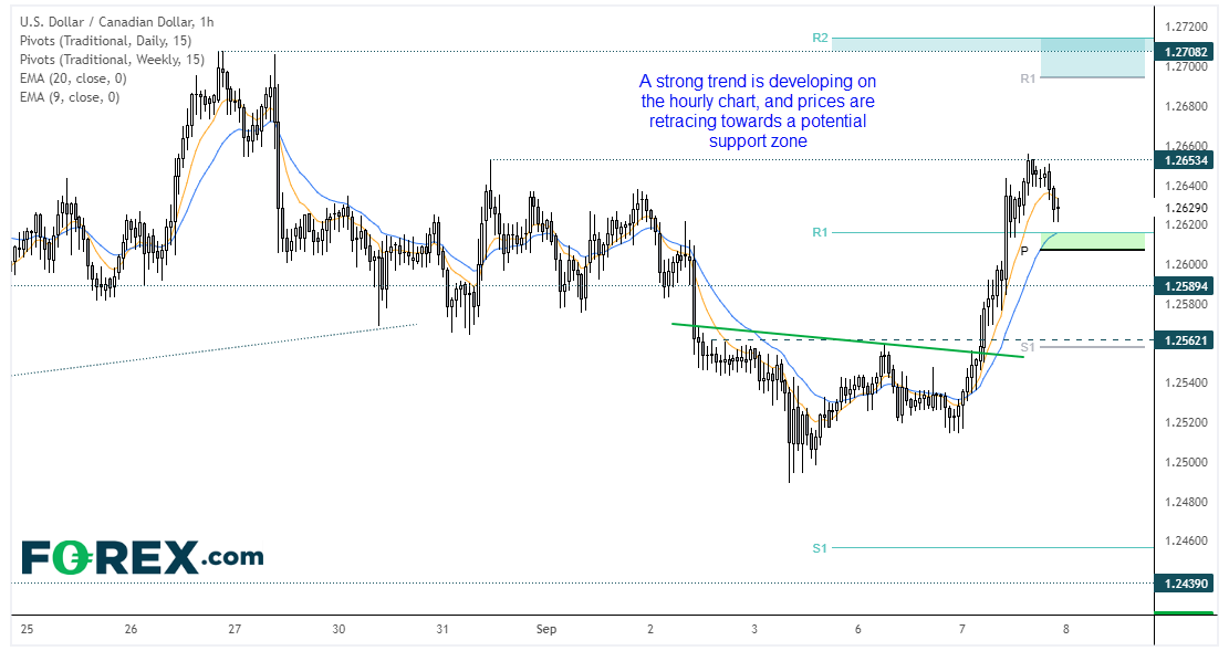 我们认为美元本周有进一步上行潜力,若加央行暂缓缩表,将助力美元/加元(昨天表现最强的货币对)攻入新高。尽管汇价已自高点回落,小时图正在形成强劲看涨趋势。但我们注意到1.2600上方有一个不错的支撑区域,日图中枢点、周图第一阻力和重要均线都汇聚于此。若这些水平可以提供支撑,且理想情况下出现看涨反转形态,我们将警惕汇价对1.2653的上破,然后进一步攻向1.2700附近阻力区。