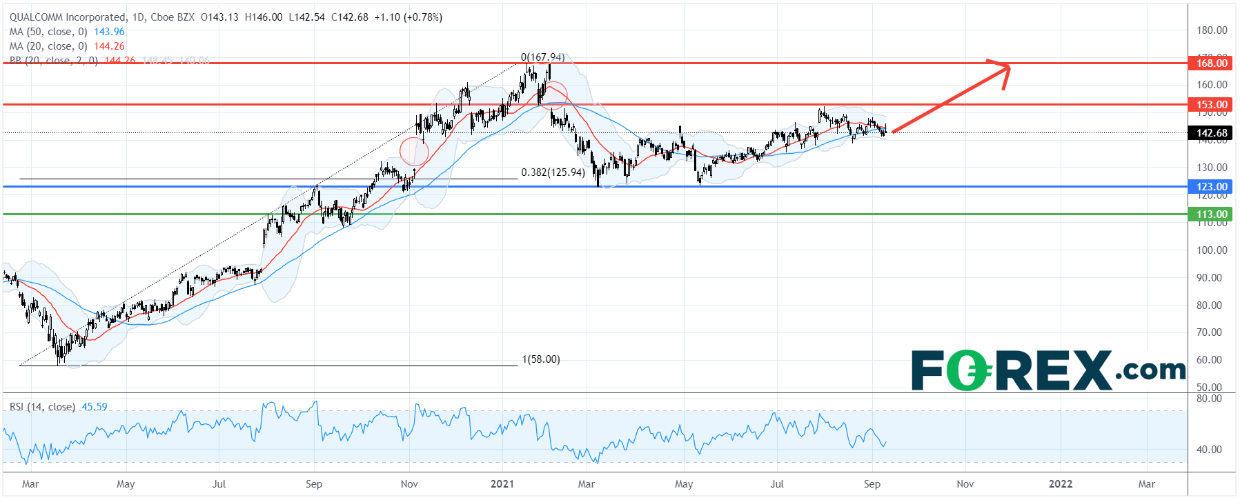 从技术角度看,如日线图所示,高通维持温和上涨的走势。它在今年上半年到达38.2%费波纳奇回档位后站稳,50日移动均线已反转向上。