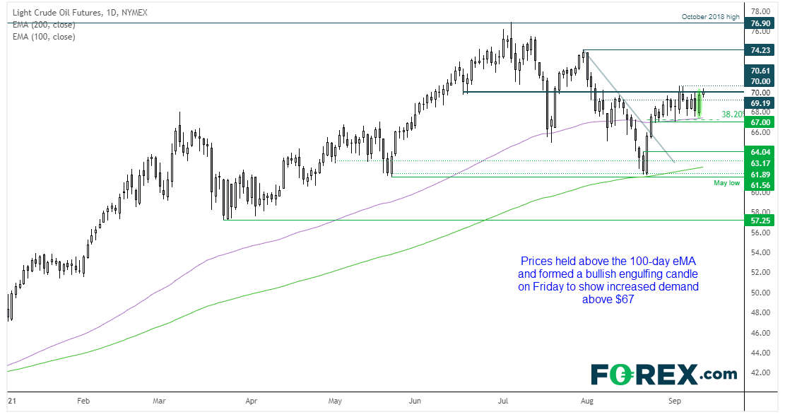 西德州中质原油(WTI)过去两周基本都在67 - 70之间徘徊。日内曾试图升穿70,但还未出现过其上方的日收盘,不过我们认为这种情况即将发生。价格守在38.2%斐波那契回档和100天EMA均线之上,而且波动性较大的交易日走势看涨。此外,周五收于一条看涨吞没K线,表明67上方看涨兴趣升温,所以,我们现正等待价格拿下70.61以发出趋势继续信号。
