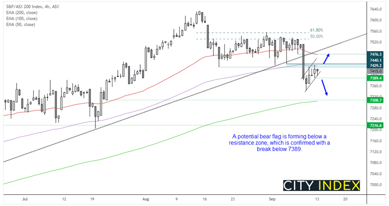 ASX200指数温和回调至由50天指数移动均线和波段低点构成的重要阻力区域7430-7440区域附近。考虑到上周在强劲的动能带动下攻克趋势支撑,8月高点以来的跌势还是有可能尚未筑底。所以,我们在观察,下跌动能是否卷土重来。4小时图形成看跌旗形形态,但期货市场暗示现货市场高开于7425附近。如果下破7389,可以假设重拾跌势,而若直接上破7440,多头重点关注7476及/或破败趋势线。