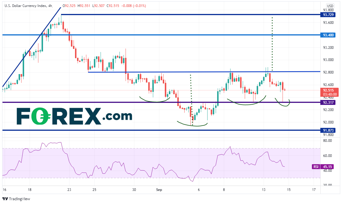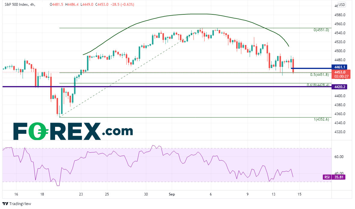 弱于预期的通胀月率发布之后,美元指数下跌,股市旋即上涨,但开盘一小时后利落反转,其中一个可能性是交易者在更好的价位上了结了头寸。标普500指数日图上已回撤至8月19日低点到9月3日高点行情的50%回档位,即4451.8附近,下个支撑区域在4420/4428,那是前述行情的61.8%回档位和水平支撑位所在。如果失守,股指可能跌至4352.6。盘中阻力位在4461和周二高点4489。请注意,这里我们说的是标普500指数的现货市场,而不是备受关注的期货市场。