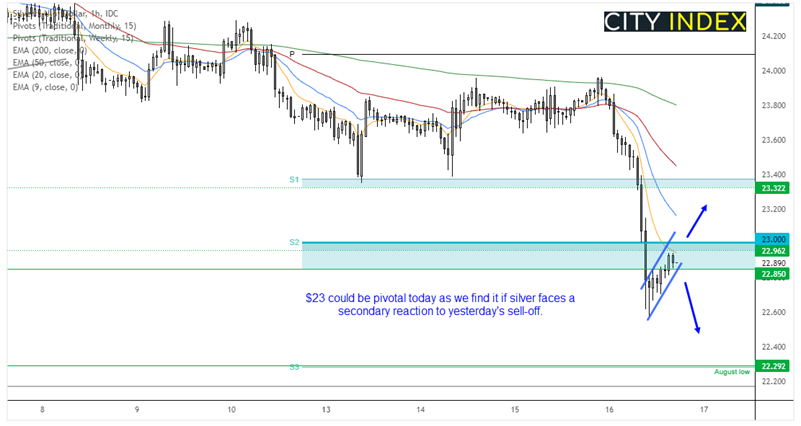 黄金和白银对隔夜强劲零售销售报告的反应较为不稳定,分别下跌4.2%和2.1%。两者中白银的短期前景似乎更加脆弱。