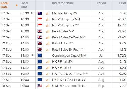 新西兰企业PMI定于AEST时间08:30发布,据预测小幅下跌至61.8,考虑到奥克兰仍处于4级封锁且新西兰其余地区仍处于2级封锁(下周一将对其进行重新评估),前述预测值仍处于相当高的水平。纽元仍是9月和过去一个月的最强主要货币,如果新西兰进一步放松封锁管控,纽元有望继续上涨。英国零售销售定于英国夏令时16:00揭晓,而美国时段的主要事件是午夜的密歇根大学消费者信心指数。