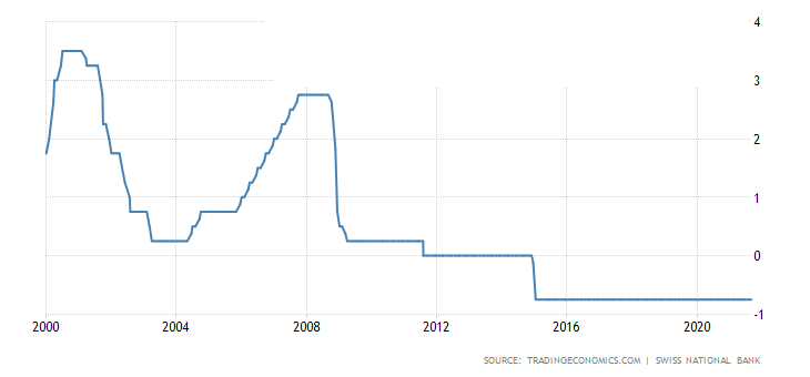 瑞士央行过去25年利率图
