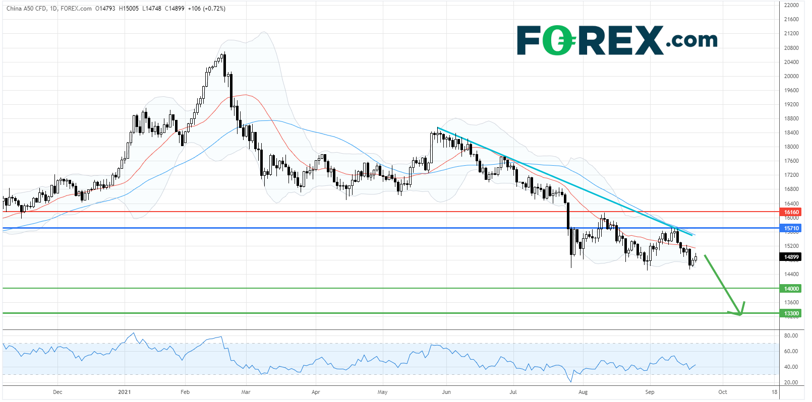 中国A50指数CFD近期仍在低位受压并再试8月低点,市场忧虑恒大地产(3333.HK)的债务危机逐渐升温,并使房地产和金融类的股票出现较大的抛售压力,而其他行业亦因市场信心受损而遭到减持。