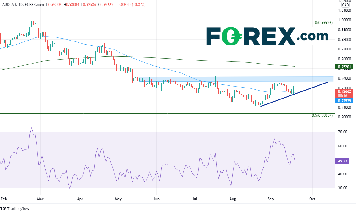 正如我的同事Matt Weller在加拿大大选前瞻的文章中所指出,夏末期间澳元/加元从近期低点走出不错的反弹行情。但该货币对在0.9375附近遇阻,后市或调头向下并重拾始于2月的较长期下跌趋势。上档阻力区域在0.9375-0.9414,接着是200天均线所在的0.9520。下档50天均线和上升趋势线相汇而成的支撑落在0.9250附近,而8月24日低点0.9114可能也构成支撑位。再往下的支撑位是2020年3月低点到2021年2月22日高点行情的50%回档位,即0.9036。