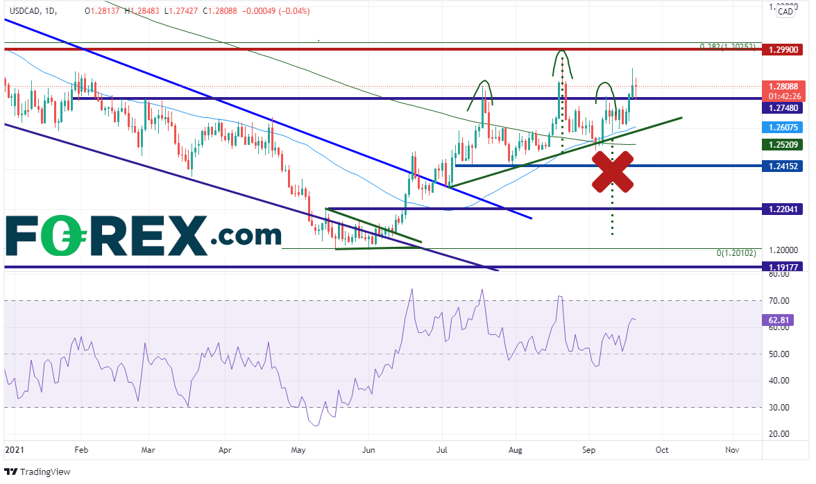 美元/加元似乎从容应对加拿大大选的结果。该货币对未能下破200天和50天均线,以及接近头肩顶形态的形态颈线,随后自1.2623反弹,至周一高点1.2896。但周二因为投资者消化加拿大大选结果(并且等待周三的FOMC会议决策),美元/加元形成了小型的内包十字星。这表明加拿大大选结果基本符合预期,加拿大政府将保持现状的结果并没有扰乱投资者的心绪。美元/加元上档阻力在水平阻力位1.2990和2020年3月高点到6月1日低点行情的38.2%回档位1.3025。下档支撑位在50天均线与上升趋势线相汇的1.2600附近。