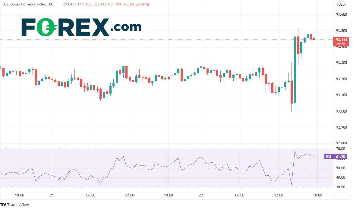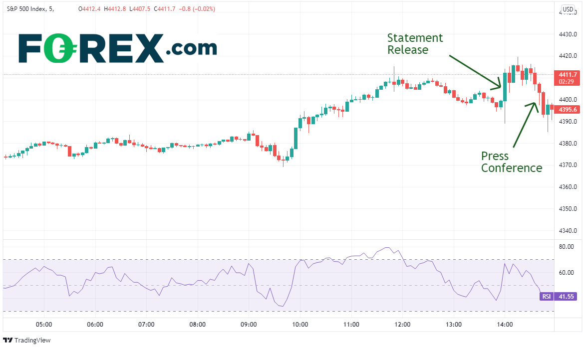 但请注意上图显示,价格在上述声明发布后30分钟左右发生了逆转。美联储主席在该声明发布后召开的新闻发布会上表示,“声明中的措词意在指出,可能最快在下次会议,缩表的标准就满足了”。他补充指出,“FOMC很多成员认为,就业通过了取得更多实质性进展的考验。我个人的观点是,距离满足缩表标准只有一步之遥”。声明中还有一句话是这样的:“缩表计划可能在明年年中落幕”。这些说法直截了当,是疫情爆发以来最强硬的表态,也出乎市场的意料。