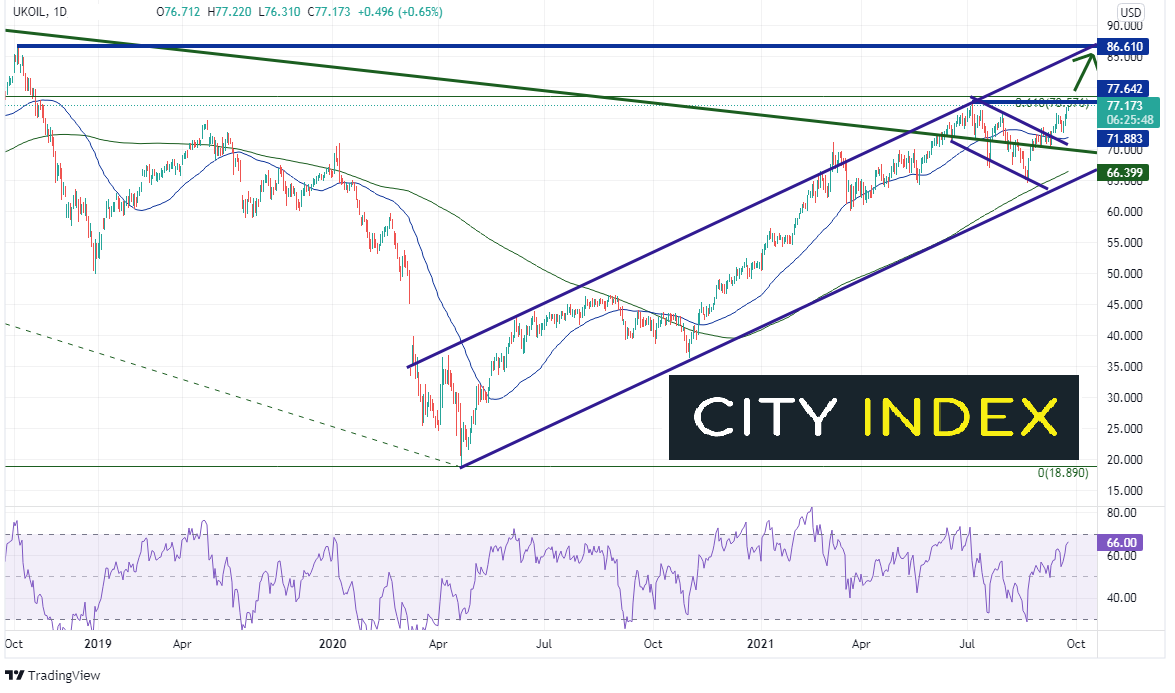 2020年4月23日,布伦特原油价格探底18.89,此后价格再未回望。油价于一个有序通道中推高,并在7月6日站上77.64高点,此处刚好落在2014年10月高点至4月23日低点下行之61.8%斐波那契回档略下方。