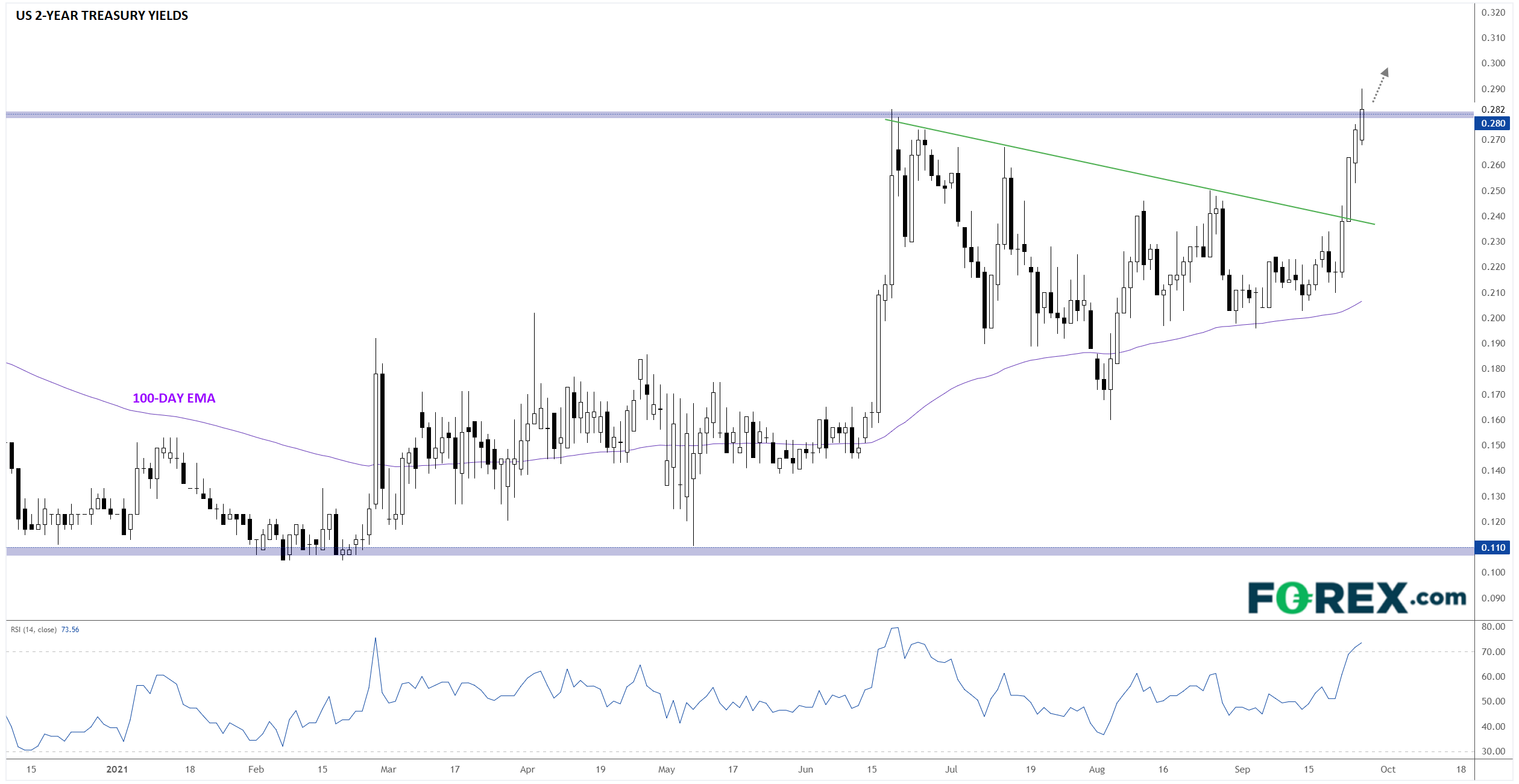 在美联储主席杰罗姆•鲍威尔上周发出美联储有意11月会议宣布缩表的明确信号之后,上述重要立法事项尘埃落定之前,美国债券交易员显然已开始计入加息预期。两年期美债收益率与美元价值通常具有最为密切的相关性,目前收益率测试0.28%一线去年3月新冠疫情爆发以来最高水平,较本月初上涨了10个基点: