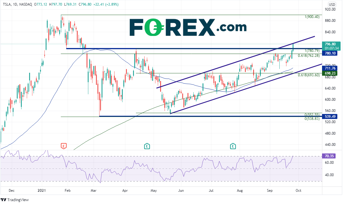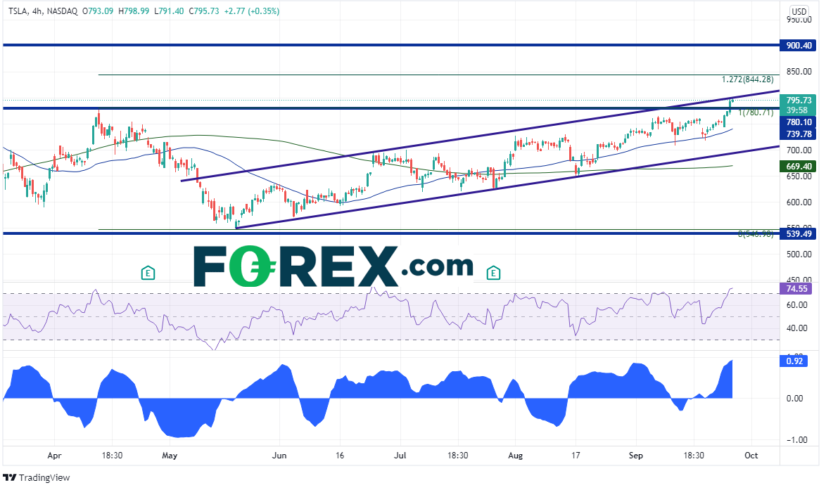 4小时图上,如果股价可以站上该趋势线兼心理整数关口阻力800,则下个阻力在4月14日高点到5月18日低点行情的127.2%延展位844.48和历史高点900.40。但若攻击失败,下档第一支撑位在780.71,接着是9月13日低点709.16,以及上升通道的下轨趋势线691.41。请注意,RSI目前处于超买区域,暗示特斯拉股价或许准备回调。