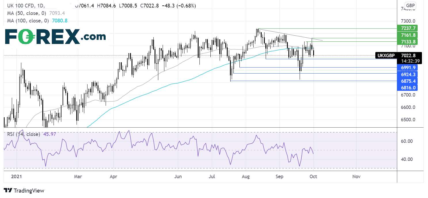 富时指数于下降趋势线阻力7160遭拒后下破日线图50和100均线。再加上RSI指标看跌,卖盘继续保持希望。