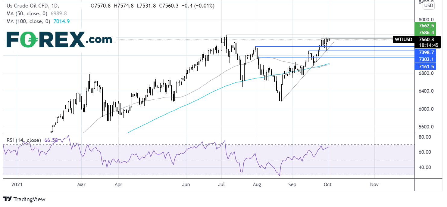 但屡次升穿75.80受挫可能导致卖方继续推低价格,探向上升趋势线支撑位和7月30日高点交汇的74.00附近。只有下破73.00,才能打消近期上升趋势,并为下探9月23日低点和8月3日高点71.60打开大门。
