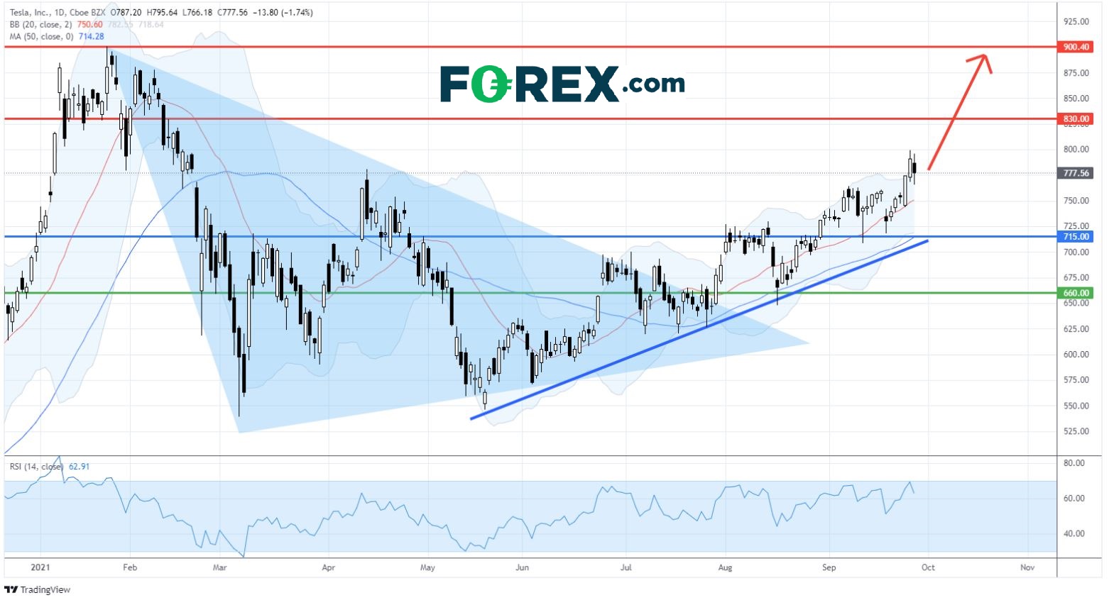 在日线图上,特斯拉的股价在1月下旬创下历史新高900.40美元,之后进入历时数個月的整固期。在这一整固期间,股价曾在在3月份跌至539.49美元。