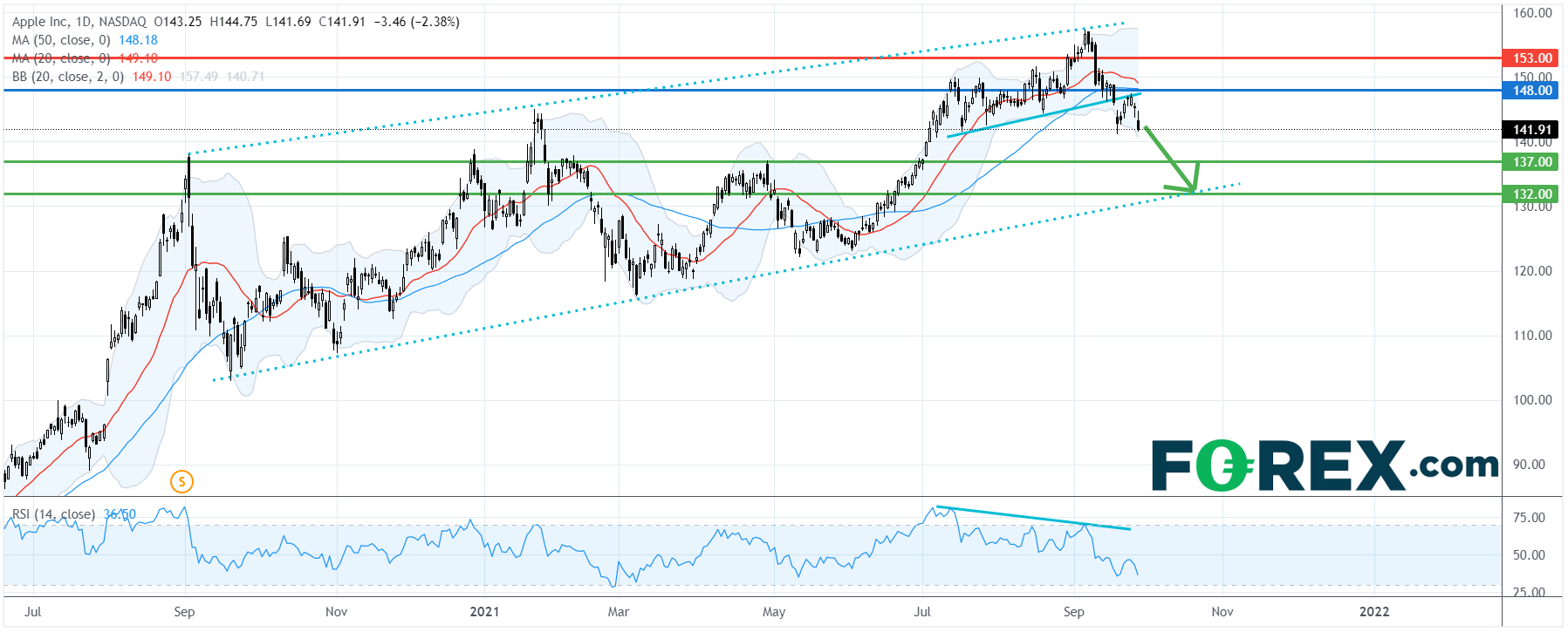 从技术角度看,如日线图所示,苹果股价有进一步向下调整的压力。此前,相对强弱指标呈现看跌背离,其后它跌破了7月以来的上升趋势线。