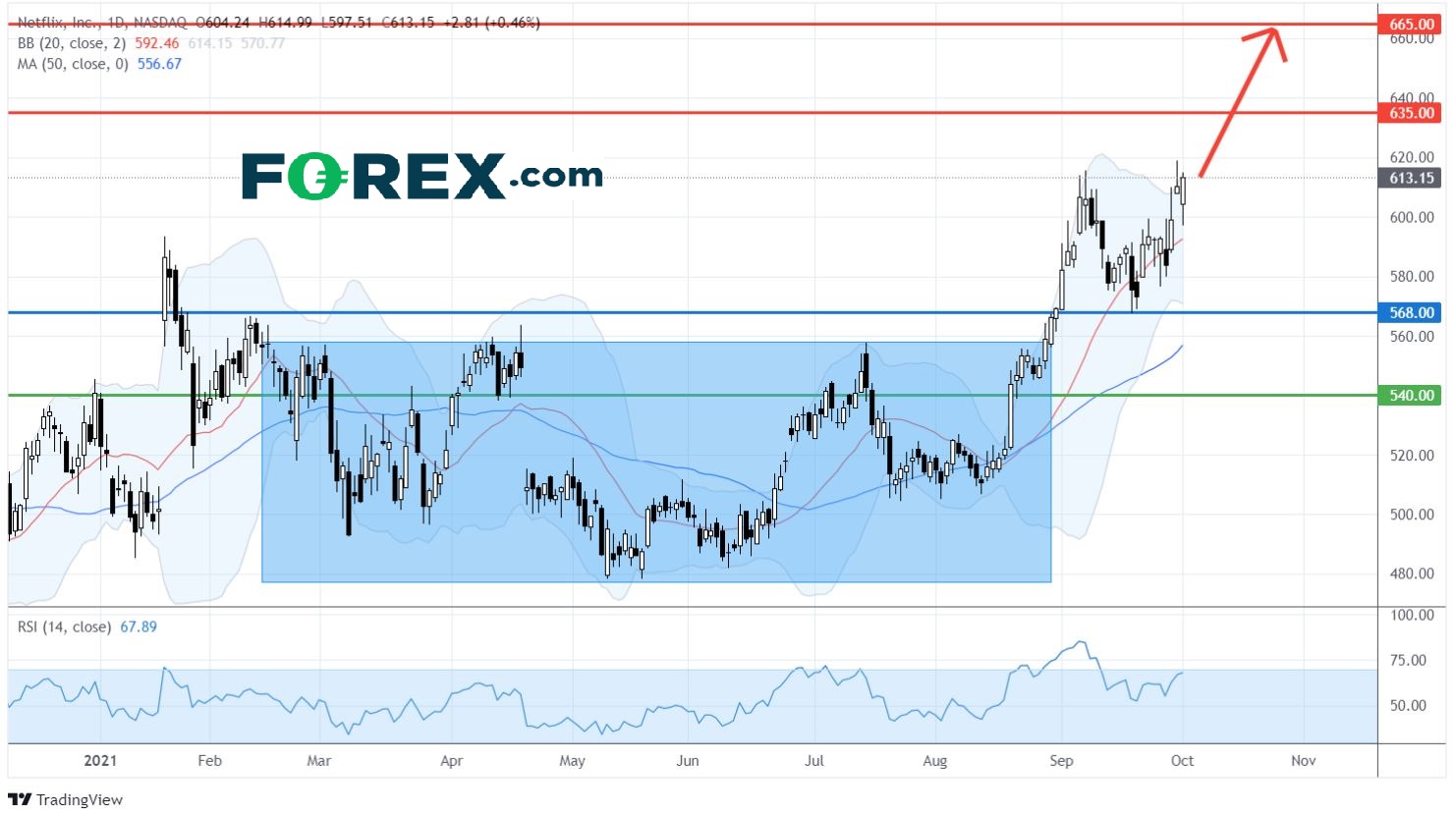 在日线图上,网飞的股价仍然做好,在上周四 (9月30日) 再创下历史新高619.00美元。