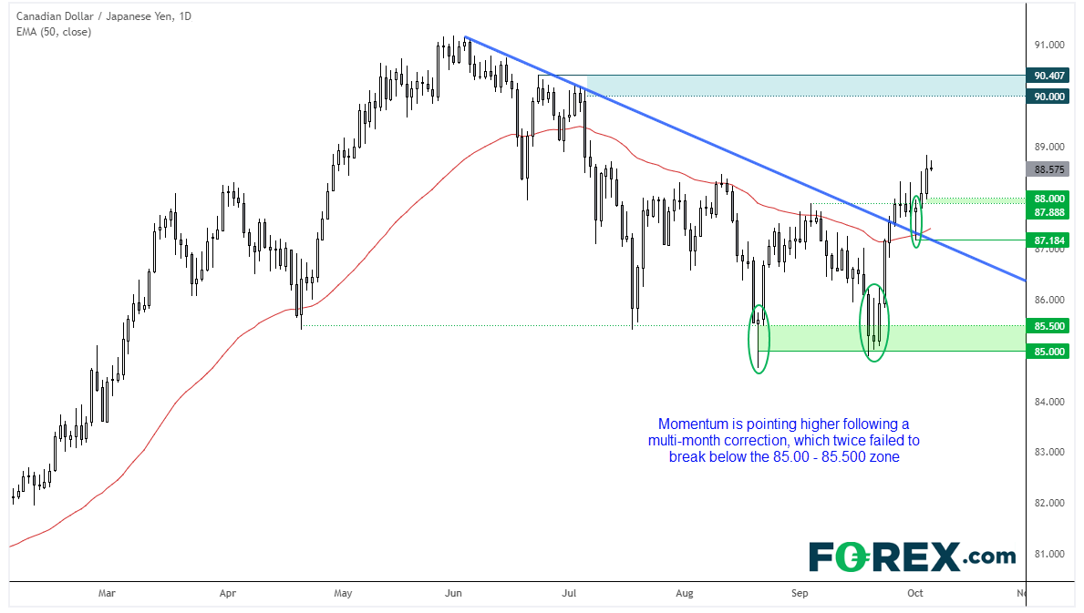 若市场情绪保持获撑,油价继续上涨,加元/日元看涨兴趣依旧。日线图显示,汇价在两次未能下穿85.00之后,已突破日线图一条回档线。上周一轮小型小回调确认已破回档线支撑意义,动能向上。日趋势在87.18上方保持看涨,但我们希望看到探入88.00下方的震荡行情,然后继续更大幅度上攻。