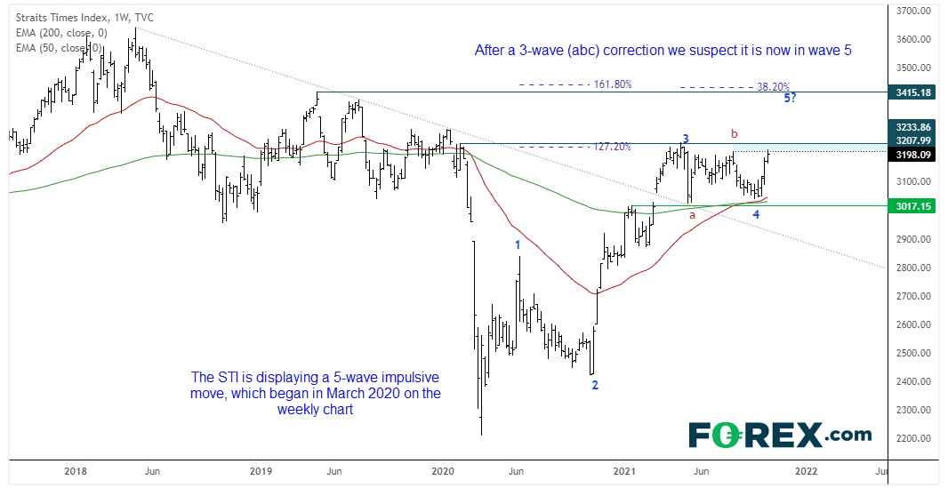 周线图上可以看到,STI指数正落在始于2020年3月低点的5浪推高走势之内。第三浪于127.2%斐波拉契扩展位和2020年2月高点停滞,或已自此完成三浪调整。鉴于价格守住3000(重要整千数位)、5月低点和200/50周EMA均线上方,我们怀疑股指修正已告一段落。