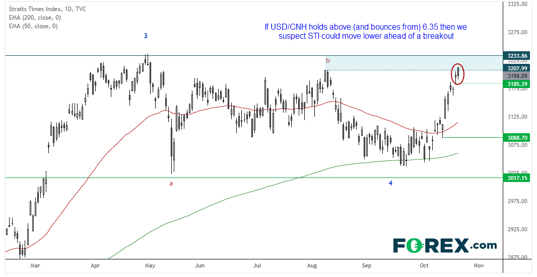 因此需要重点关注,离岸人民币正接近关键支撑位6.35,若能守住(至少一开始),则意味着STI指数可能暂停上行或是自附近阻力区回落。