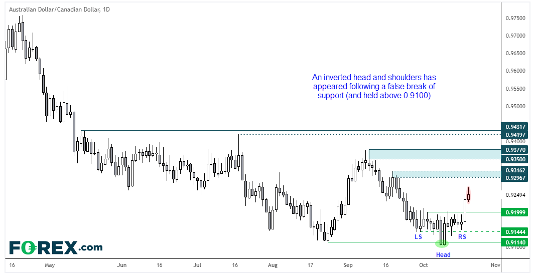 FOMC中立派Randal Quarles并不认为美联储在抗击通胀方面落后了,但也确实支持在11月缩表。这不同于其同事Christopher Weller昨天的评论,后者当时表示,通胀仍然是美联储面临的最大威胁。纵然如此,美元指数形成看跌内包K线并守住94.50支撑位。该位可能证实为未来几天的枢轴价位。