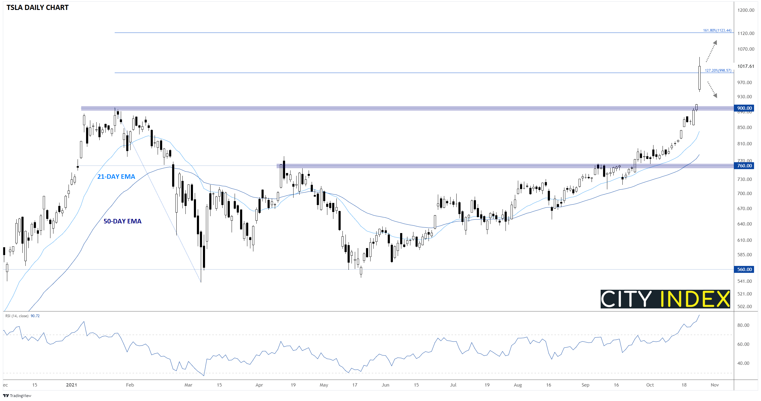 看看该股,很明显,当它周五首次收于900美元上方时,1000美元成为了一个重大心理目标。展望后市,关键是要观察本周股价能否守住1000美元关键水平。巧合的是,1000美元也是今年最猛跌幅之127.2%斐波那契水平。技术面角度看,1000美元上方下个需要关注的水平将是1125美元附近161.8%斐波那契扩展;同时,若下穿前阻力现支撑900美元,短线看涨将存疑。